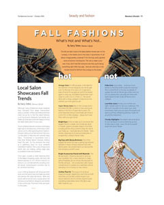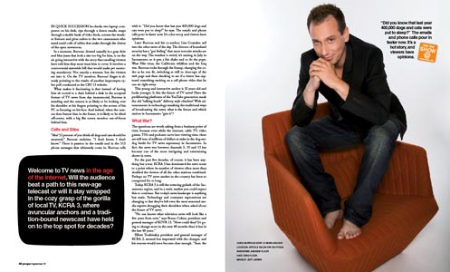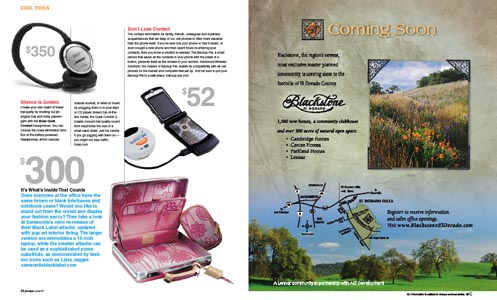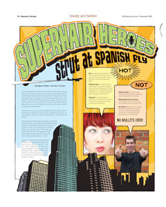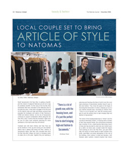 As the lifestyle and features editor of the natomas journal, I was simultaneously blessed and cursed with the responsibility of managing the PRODUCTION of an entire publication every month. With a circulation of 25,000 this small lifestyle magazine INSERT was mine to rework. prior to this position I hadn't paid much attention TO PRINT design and had no idea how integral design was to the process of editing images. at a small community newspaper, with little access to the type of photography I love, I was able to really develop my eye in terms other than those DICTATED by the PHOTOGRAPHIC image. I was able to work with dante creative group and designer drew newbold to redesign and update both the look and feel of the magazine, as well as redirect some of the content. I had the chance to develop a fashion section and to participate creatively in every aspect of the section's creation from contacting writers and photographers with story CONCEPTS to styling and art directing shoots and the eventual DESIGN of the page. my time at the Journal IGNITED a passion for design and for the imagery of slicker formats. In effect, these examples are the beginning of what would become a solid passion for the editing of visual material and PHOTOGRAPHY created for magazines.